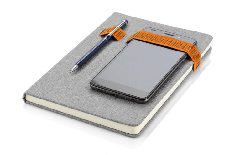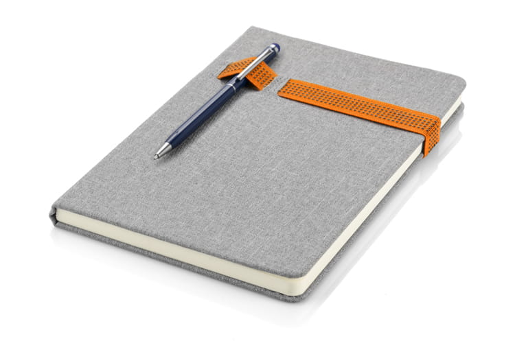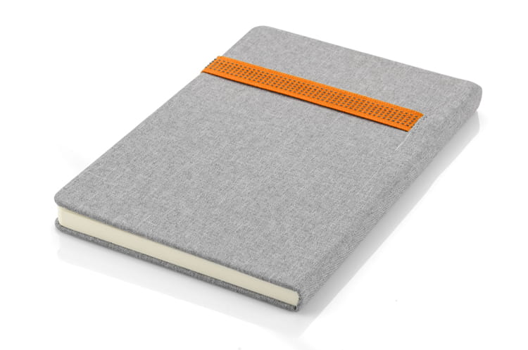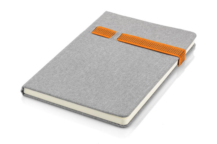 Notes HOLDI posiada bardzo ciekawą okładkę w kolorze szarym, wyglądem przypominającą lniany materiał. Zamykany jest za pomocą kolorowej gumki, która może służyć również jako miejsce na długopisy lub inne niezbędne przedmioty. Notes A5. 80 kartek w linie. Grubość papieru 80 gsm