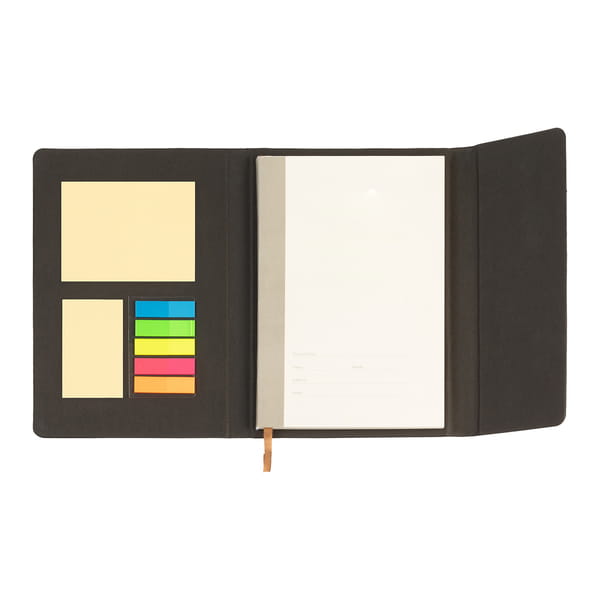70 kartkowy notes w linie, w twardej oprawie. Zamykany magnetyczną listwą. Zawiera dwa komplety 25 żółtych karteczek samoprzylepnych w rozmiarach 100x76 mm i 45x72 mm oraz 25 samoprzylepnych foliowych zakładek indeksujących po 5 w każdym kolorze.