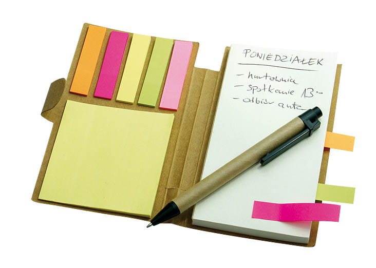 Notes z karteczkami memo oraz długopisem. Notes w oprawie tekturowej. Długopis ekologiczny wykonany z tektury i tworzywa z recyklingu. Długopis z czarnym wkładem.