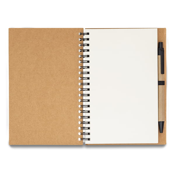 Notes formatu B6 z 70 gładkimi kartkami (70 g/m2) i podwójną spiralą. Dopasowany długopis z kartonu z recyklingu. Wkład w kolorze niebieskim. Dopasowany elastyczny uchwyt na długopis.