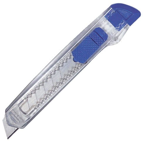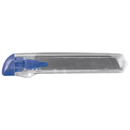 Transparentny nóż do kartonu z kolorową końcówką i łamanym ostrzem - praktyczny i wygodny w użyciu.