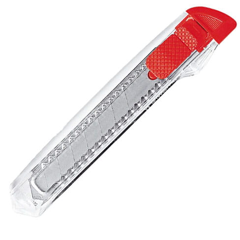 Transparentny nóż do kartonu z kolorową końcówką i łamanym ostrzem - praktyczny i wygodny w użyciu.