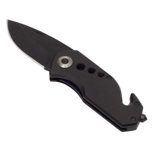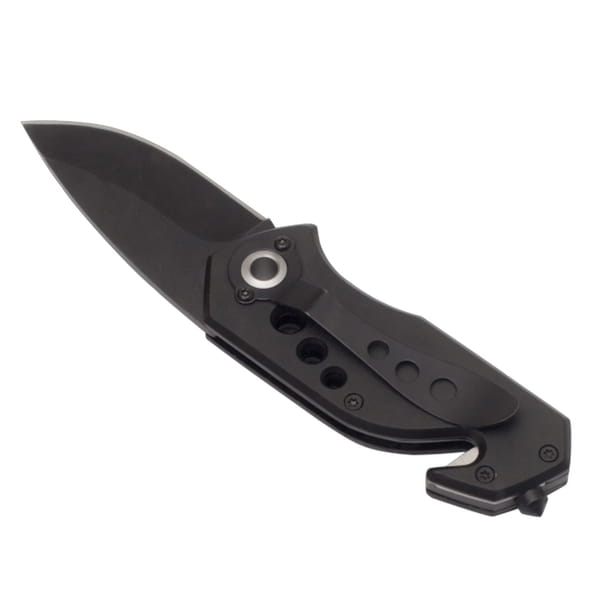 Wykonany z metalu 2CR13 składany nóż z ostrzem o długości 58 mm, wyposażony dodatkowo w młotek do rozbicia szyb, przecinak do samochodowych pasów bezpieczeństwa i klip do zaczepienia. Pakowany w czarne pudełko kartonowe.
