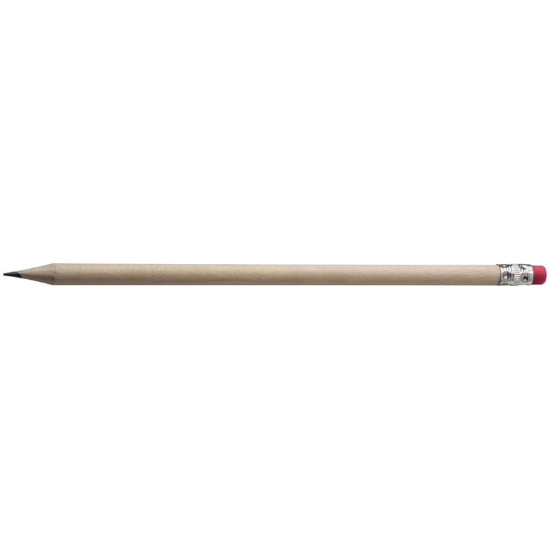 Drewniany ołówek z gumką do mazania, zatemperowany.