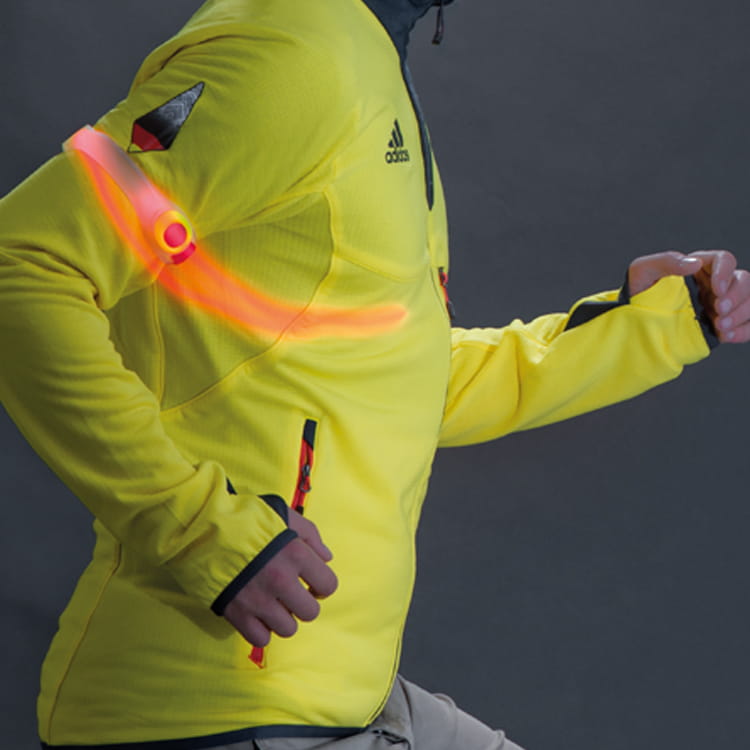 Opaska na ramię z diodami LED, którą można łatwo założyć dzięki gumce. Po naciśnięciu czarnego przycisku diody zaczną świecić na czerwono - można ustawić światło ciągłe lub migające.