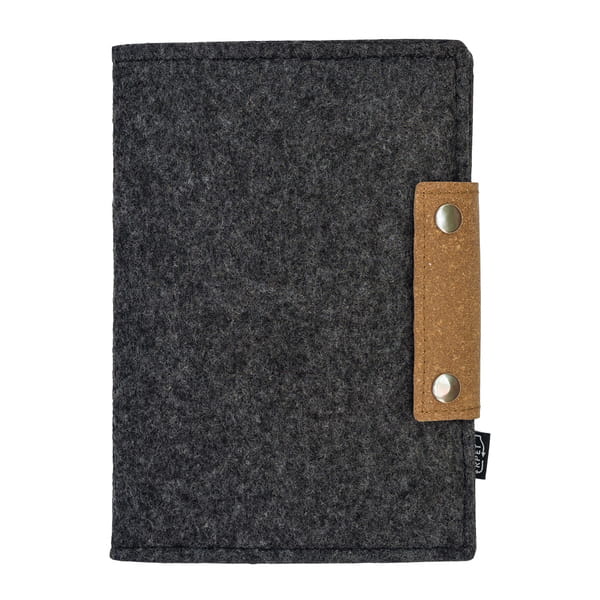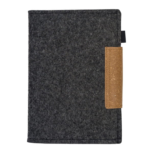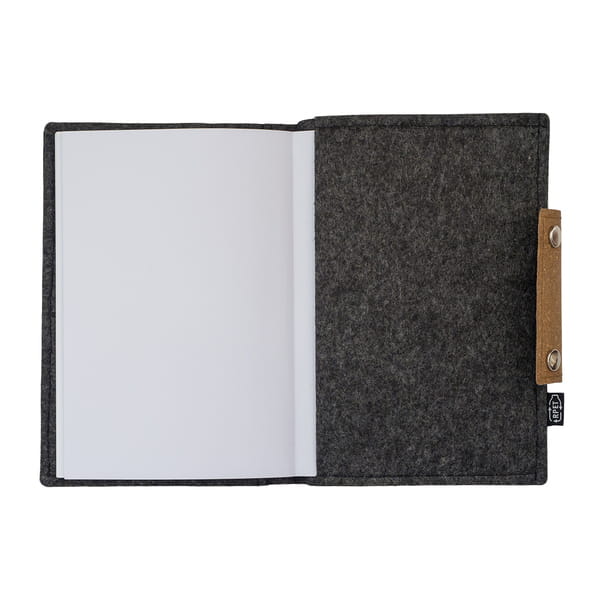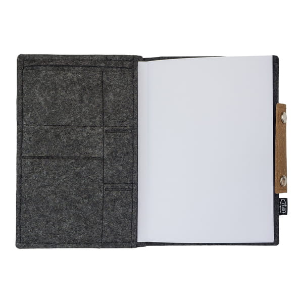 Notatnik/organizer. Okładka z filcu RPET z zamknięciem wykonanym ze skóry z recyklingu. Wewnątrz okładki znajdują się kieszonki np: na telefon, długopis i wizytówki. Wymienny notatnik A5 w linie (80 arkuszy 70 g/m²).