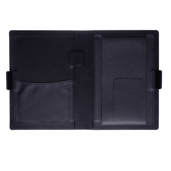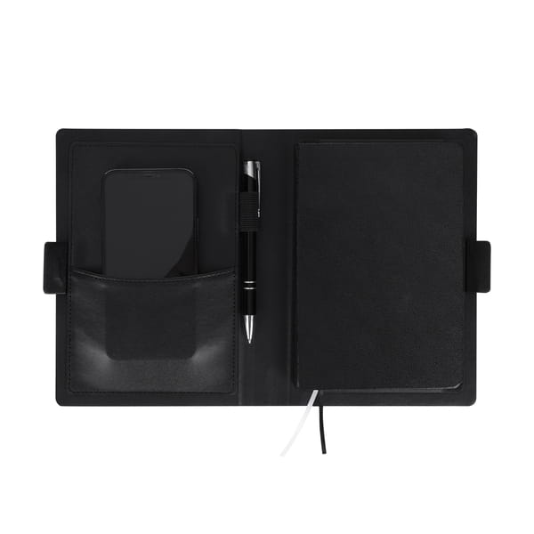 Elegancki organizer z notesem w linie (80 kartek), posiada kieszeń na telefon, uchwyt na długopis oraz kieszonkę na wizytówki. Zamykany na magnetyczne zapięcie. Możliwość wymiany notesu. Rozmiar 12,5 x 18,4 cm. Telefon i długopis nie jest dołączony.