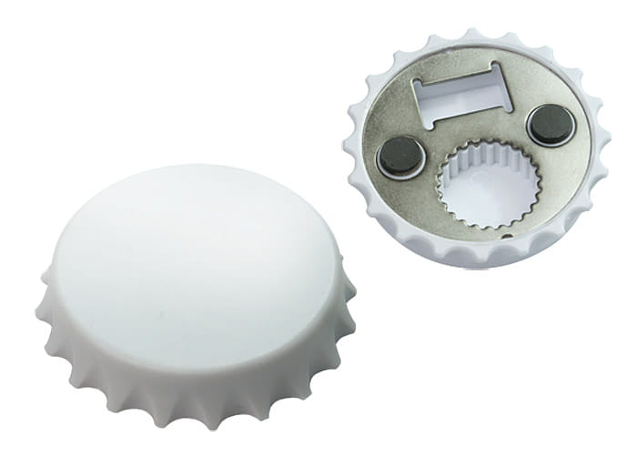 Otwieracz do butelek w kształcie kapsla. Posiada wbudowany magnes, za pomocą którego otwieracz można przymocować do lodówki.