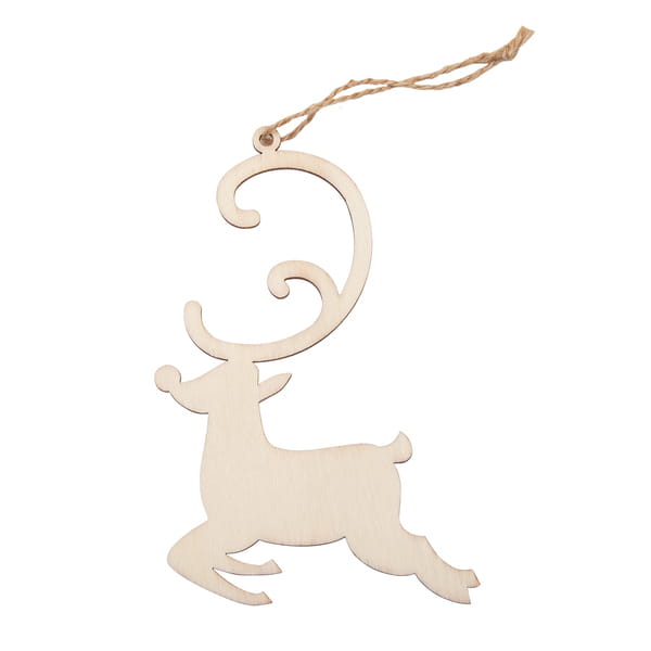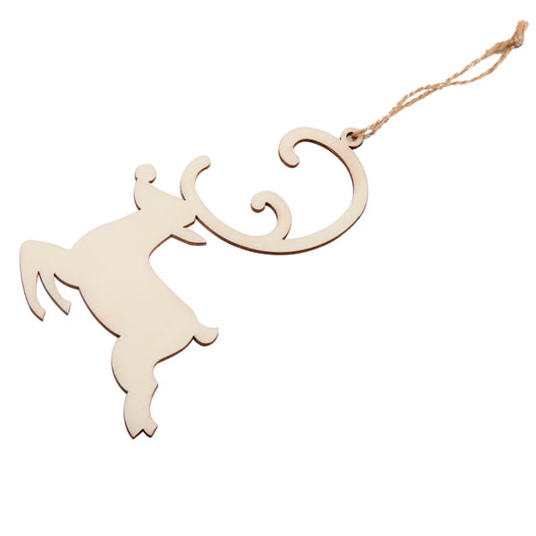 Drewniana ozdoba choinkowa w kształcie renifera, wyposażona w sznureczek do zawieszenia.