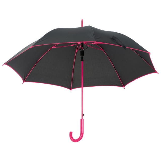 Czarny parasol o wyjątkowym designie. Rączka oraz krawędzie parasola są w tym samym, ale innym niż całość kolorze. Parasol posiada materiałowy pokrowiec. Pojedynczo pakowane w woreczek foliowy.