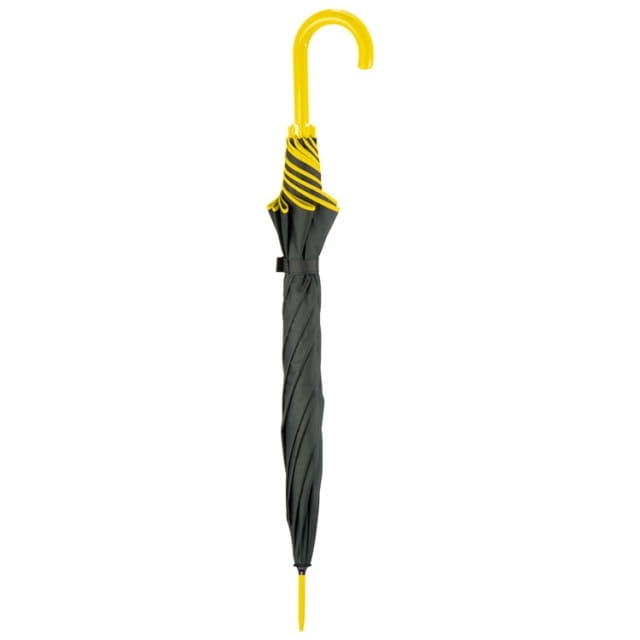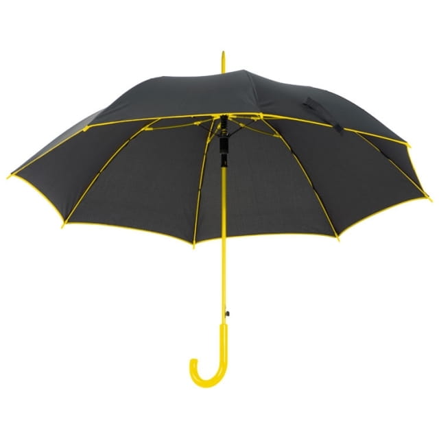 Czarny parasol o wyjątkowym designie. Rączka oraz krawędzie parasola są w tym samym, ale innym niż całość kolorze. Parasol posiada materiałowy pokrowiec. Pojedynczo pakowane w woreczek foliowy.