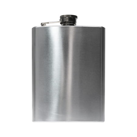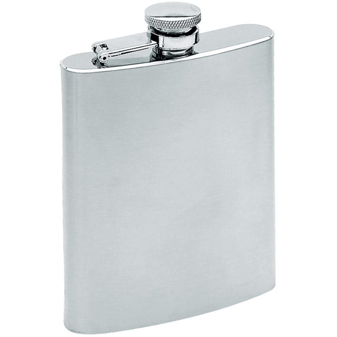 Piersiówka ze stali nierdzewnej o pojemności 240 ml, z bezpiecznym zamknięciem.