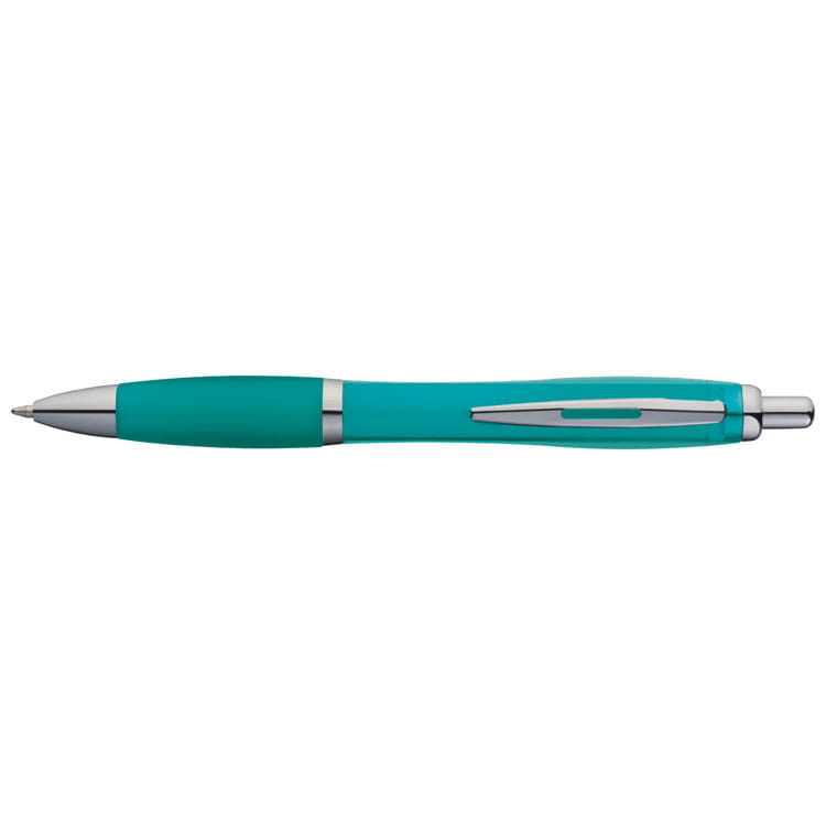 Stylowy, wysokiej jakości długopis. Kombinacja kolorowego, transparentnego korpusu i błyszczących dodatków - skuwki, pierścienia, włącznika i metalowego klipu decydują o jego atrakcyjnym wyglądzie. Antypoślizgowa gumka na korpusie i duży, niebieski wkład sprawiają, że pisanie jest łatwe i wygodne.