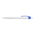 Plastikowy długopis o klasycznym, opływowym kształcie i niebieskim wkładzie. Dzięki białemu korpusowi kolorowy klip sprawia, że długopis rzuca się w oczy.