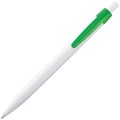 Plastikowy długopis o klasycznym, opływowym kształcie i niebieskim wkładzie. Dzięki białemu korpusowi kolorowy klip sprawia, że długopis rzuca się w oczy.