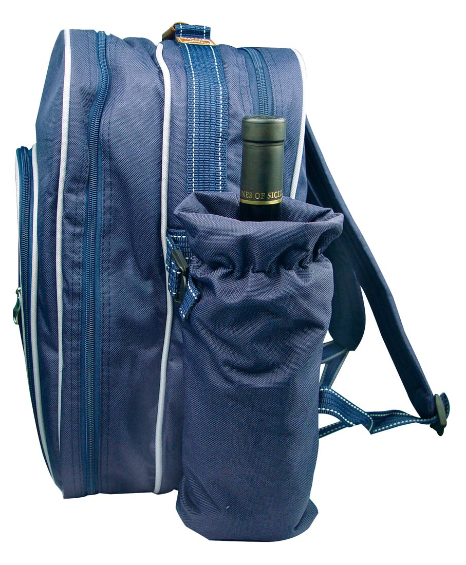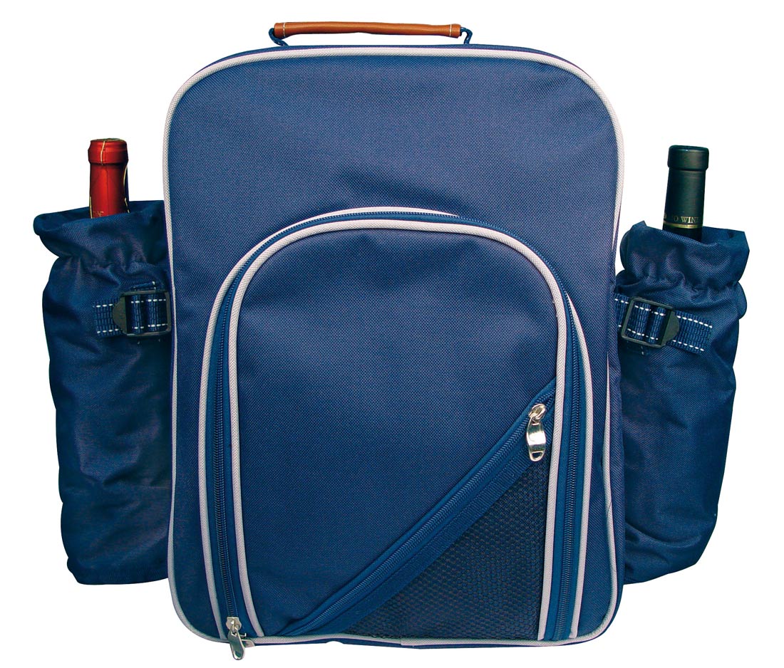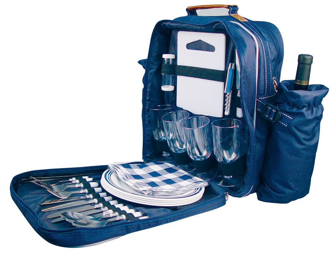 Plecak piknikowy z wyposażeniem na 4 osoby. Zawiera komory chłodzące na jedzenie oraz butelki, plastikowy zestaw naczyń i sztućców, małą deskę, korkociąg, pojemniczki na pieprz i sól oraz nóż.