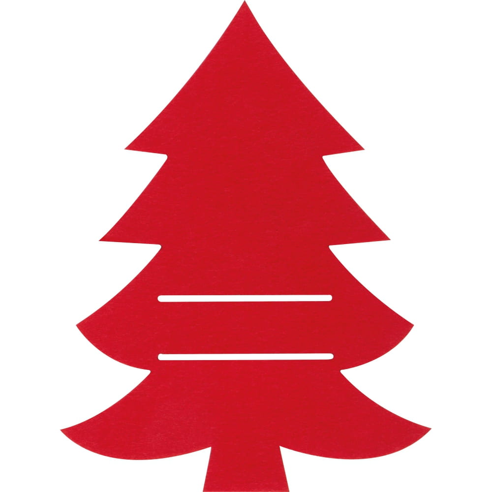 Świąteczne podkładki do sztućców w kształcie choinki, wykonane z czerwonego filcu.