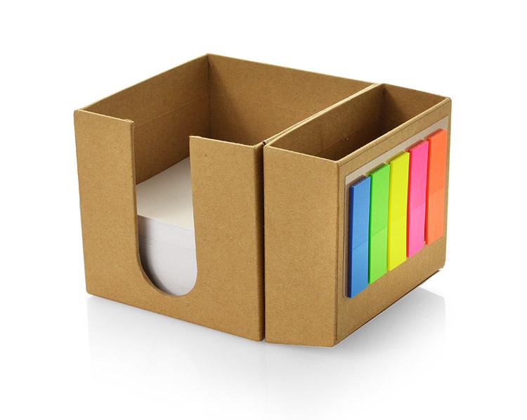 Oryginalny zestaw karteczek w tekturowej kostce - zestaw ten można rozłożyć do formy wygodnego stojaka na biurko. W środku znajduje się zestaw białych karteczek biurowych, pojemnik na artykuły piśmiennicze oraz kolorowe zakładki samoprzylepne z tworzywa PET. Tworzywo PET użyte do produkcji zakładek sprawia, że znacznie lepiej kleją się do kartek i są trwalsze w porównaniu do zakładek papierowych. Jeżeli szukasz funkcjonalnego produktu, który jednocześnie jest ekologiczny to jest to idealny wybór. W zestawie długopis.