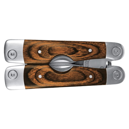 Wielofunkcyjny przyrząd ze stali nierdzewnej z drewnianymi uchwytami. Narzędzie wyposażono w nożyk, kombinerki, piłkę, nożyczki i śrubokręt.