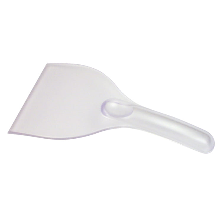 Praktyczna skrobaczka do szyb o nowoczesnym wyglądzie, wykonana z transparentnego, "szronionego" plastiku.
