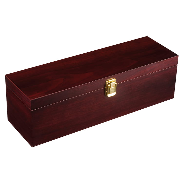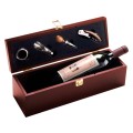 Luksusowa skrzynka na wino, wyposażona w nóż kelnerski, korek, lejek i ociekacz.