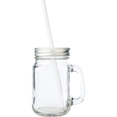 Słoik do picia 480 ml, z rączką i srebrnym wieczkiem z otworem na słomkę