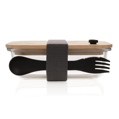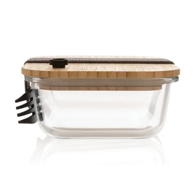 Pojemnik na żywność, wykonany z wysokiej jakości szkła borokrzemowego odpornego na różnice temperatur, szczelne, bambusowe wieczko, łyżkowidelec w kompleci