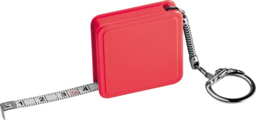 Stalowa miarka o długości 1 m w kwadratowej obudowie z kolorowego plastiku, zawieszona na praktycznym breloku.