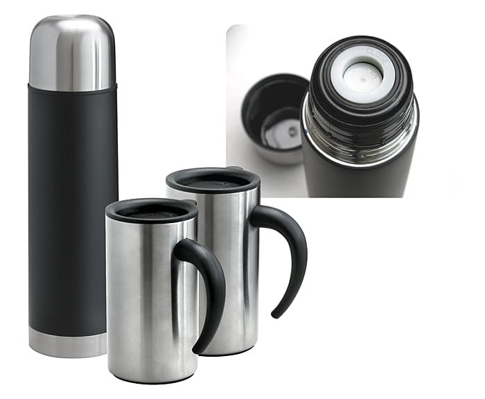 Termos ze stali nierdzewnej o pojemności 500 ml oraz dwa kubki termiczne o pojemności 280 ml. Zestaw niezbędny w każdej podróży, pakowany jest w czarny kartonik.