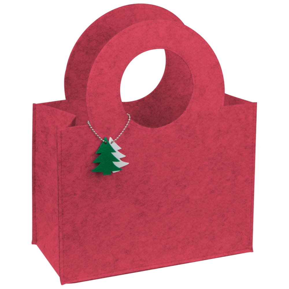 Świąteczna filcowa torba z zawieszką w kształcie choinki, która może być miłym podarunkiem lub służyć do zapakowania innych prezentów.