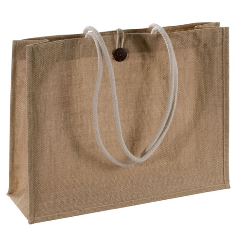 Solidna torba z juty, z uchwytami wykonanymi z mocnego sznurka, zamykana na guzik.
