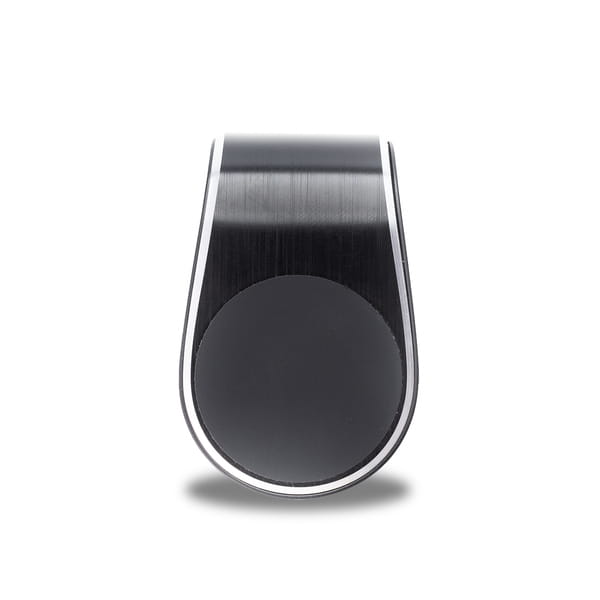 Magnetyczny uchwyt na telefon montowany do kratki wentylacyjnej samochodu. W zestawie samoprzylepna metalowa blaszka do telefonu.