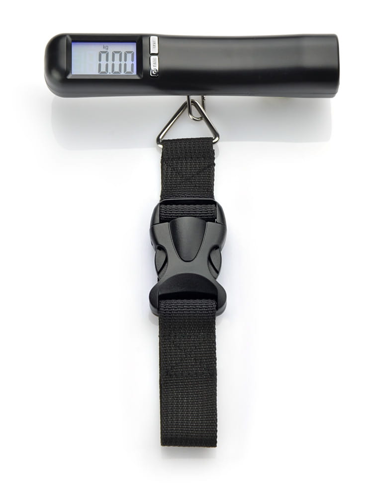Elektroniczna waga do walizek. Wyświetla wagę w czterech jednostach- gramy, kilogramy, uncje i funty.