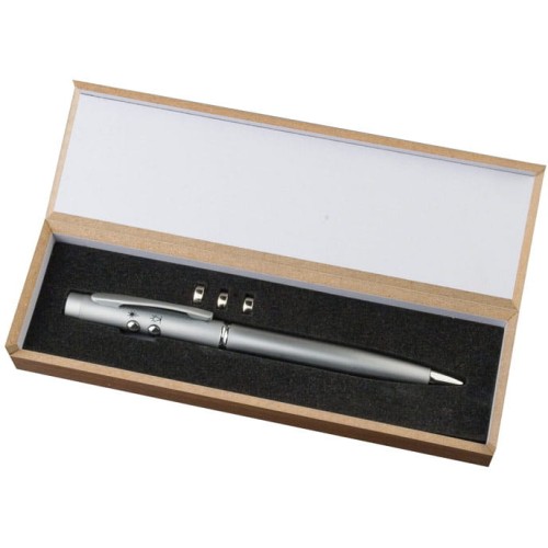 Wskaźnik laserowy, lampka LED i długopis w jednym. Wszystko zamknięte w estetycznym, drewnianym pudełku. Idealny gadżet dla każdego, komu przyjdzie prowadzić prezentacje. Długopis posiada niebieski wkład. Produkt zawiera baterie.