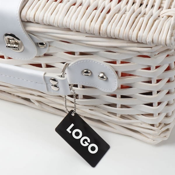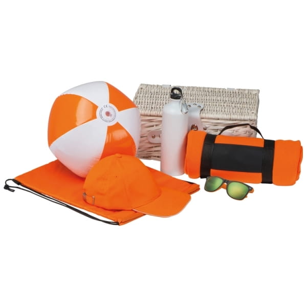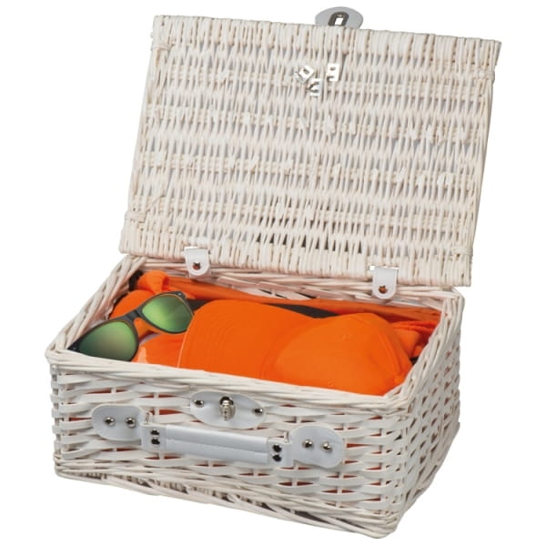 Zestaw plażowy zapakowany w biały wiklinowy kosz. Zestaw zawiera: kocz polarowy, czapkę z daszkiem, okulary, bidon i piłkę plażową. Do koszyka przymocowana jest metalowa blaszka, na której można umieścić logotyp.