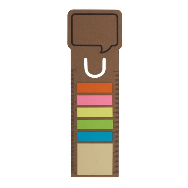 Zakładka do książek, która także może służyć jako linijka o długości 13 cm/5 cali. Zastosowano papier wykonany z surowców wtórnych o gramaturze 500 g/m2. Dołączone żółte karteczki samoprzylepne o gramaturze 75 g/m2 w ilości 15 szt. oraz 5 x 15 karteczek memo o gramaturze 75 g/m2. Podwójna podziałka CALE (5?) i CENTYMETRY (13 cm)
