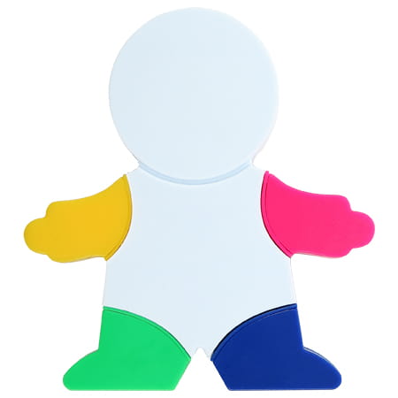 Zestaw 4 zakreślaczy w kształcie ludzika z precyzyjnie ściętą końcówką kreślącą, która pozwala rysować linie od 2 do 5 mm. Dzięki odpowiedniemu dobraniu pigmentów, zakreślacze we właściwy sposób wyeksponują dowolny fragment tekstu nie zamazując go ani nie rozmywając i wystarczą na bardzo długo. Obudowa zakreślacza utrzymana w kolorze tuszu. Komplet tworzy piękną dekorację na biurku. Dodatkowo na „głowie” znajduje się miękka materiałowa nakładka, która umożliwia czyszczenie delikatnych powierzchni. Ponadto w główce znajduje się wysuwana miękka szczoteczka, która doskonale się sprawdzi przy czyszczeniu klawiatury. Dopełnieniem może być własna grafika umieszczona na białym Plastikowym elemencie.