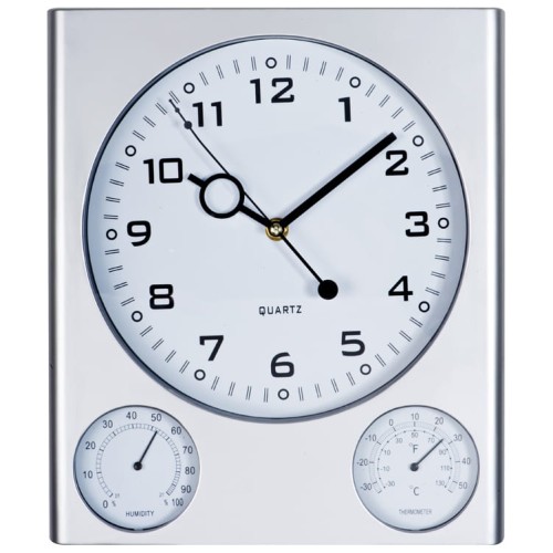 Stylowy zegar ścienny "Trio", wykonany z plastiku, został dodatkowo wyposażony w termometr i higrometr (białe tarcze). Produkt nie zawiera baterii.