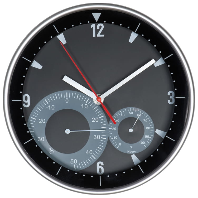Nowoczesny zegar ścienny z termometrem i higrometrem, wykonany z plastiku. Produkt nie zawiera baterii.