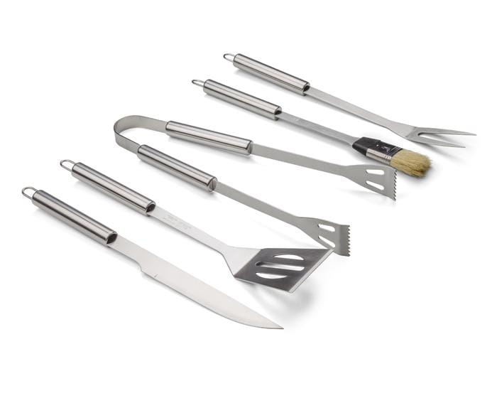 Zestaw do grilla pakowany w walizkę: szczypce, łopatka, nóż, widelec i pędzelek.