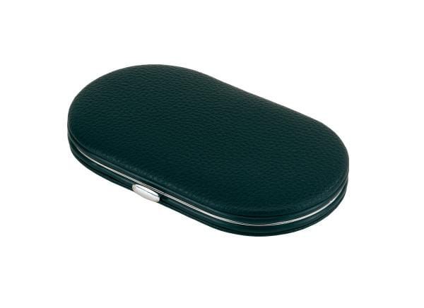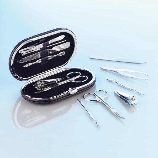 Elegancki zestaw do manicure DENISE zawiera nożyczki, pilniczek, pincetę, obcinacz, 2 patyczki do manicure, zapakowany w owalne pudełko otwierane przyciskiem.