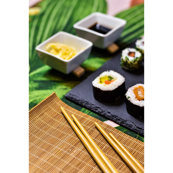 Efektowny zestaw do sushi. Składa się z dużej kamiennej deski, bambusowych pałeczek, porcelanowych podstawek, bambusowej maty oraz dwóch miseczek na sos. Doskonały prezent dla miłośników sushi.