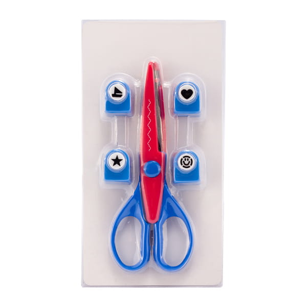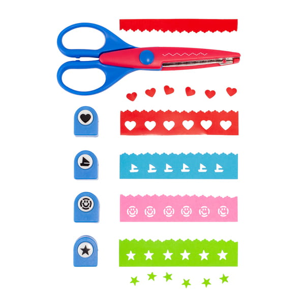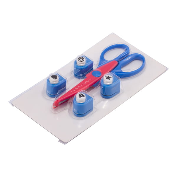 Zestaw składający się z 4 ozdobnych mini dziurkaczy do papieru i nożyczek do wycinania dekoracyjnych wzorów. Doskonały do zabawy i dekorowania np. kartek okolicznościowych i wielu innych projektów plastycznych. nożyczki S155 x W65 x G17 mm, dziurkacz S24 x W29 x G20 mm