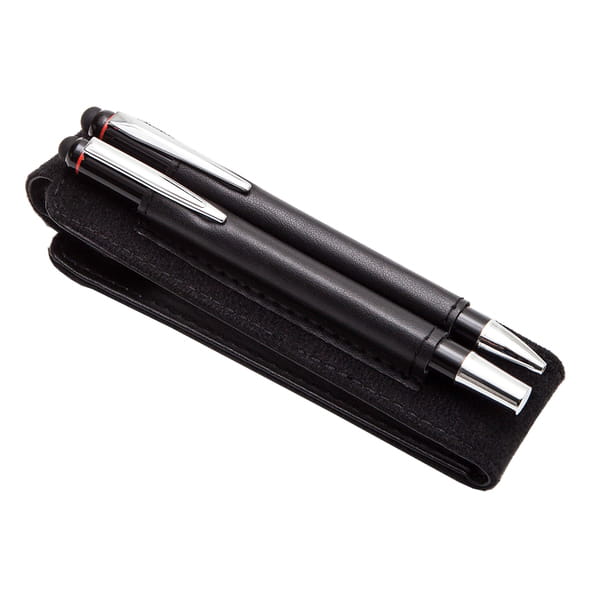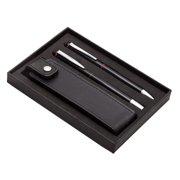 Zestaw składający się z aluminiowego długopisu i pióra kulkowego wyposażonych w końcówkę do obsługi ekranów dotykowych, w etui z ekoskóry. Chromowane dodatki. Wkład do długopisu o średnicy 1,00 mm w kolorze niebieskim, nabój o średnicy 0,7 mm do pióra kulkowego także w kolorze niebieskim. Pakowany w czarne opakowanie upominkowe, pudełko: 170 x 122 x 26 mm, długopis oraz pióro: 145 x 10 x 10 mm