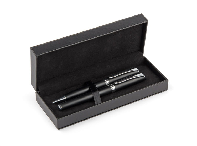 GEORGIA to elegancki zestaw piśmienniczy składający się z długopisu oraz pióra wiecznego. Przybory piśmiennicze wykonane z metalu zapakowane są w etui z czarnej ekoskóry. Długopis z mechanizmem typu twist. Do pióra wiecznego dołączony jest jeden nabój z atramentem. Wkład długopisu oraz atrament naboju do pióra w kolorze czarnym.