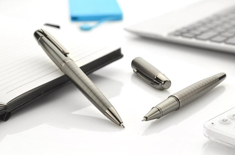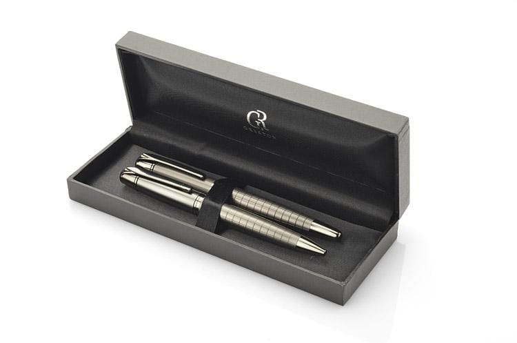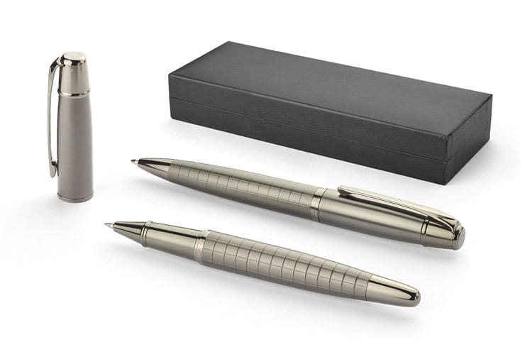 Elegancki zestaw prestiżowej marki GESSTOR cechującej produkty wysokiej jakości o unikatowym wzornictwie. Czarne pudełko zawiera długopis oraz pióro kulkowe w kolorze grafitowym. Oba elementy wykonane są w całości z metalu, w dolnej części ozdobione ciekawą fakturą kratki. Elementy posiadają oznaczenie marki Gesstor na końcówkach.