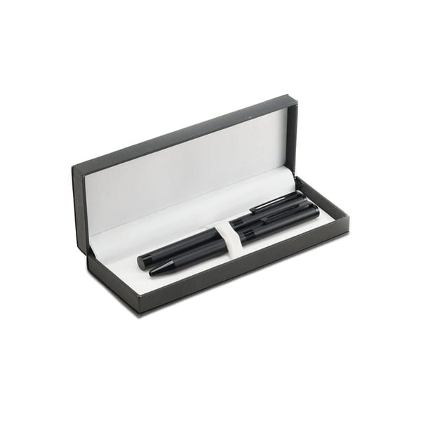 Zestaw piśmienniczy składający się z długopisu i pióra kulkowego w upominkowym etui. Wkłady w kolorze niebieskim.