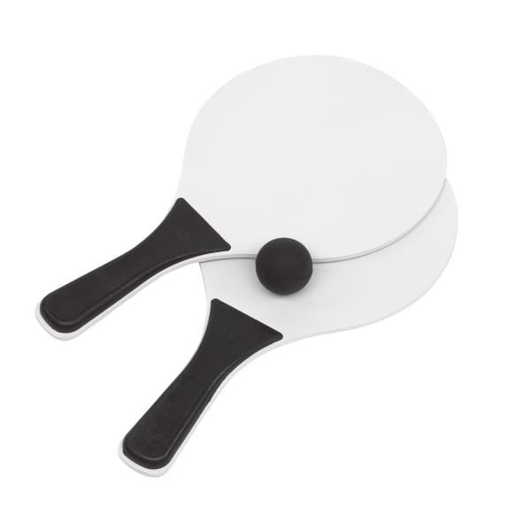 Zestaw plażowy SUMMER FEELING zawiera dwie drewniane paletki z kolorowymi uchwytami, jedną miękką piłkę, zapakowany w siatkową torbę.