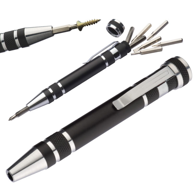 Ten mały śrubokręt wyposażony jest w 8 różnych końcówek. Dzięki niewielkim rozmiarom można go wszędzie ze sobą nosić. Pakowany pojedynczo w biały kartonik.