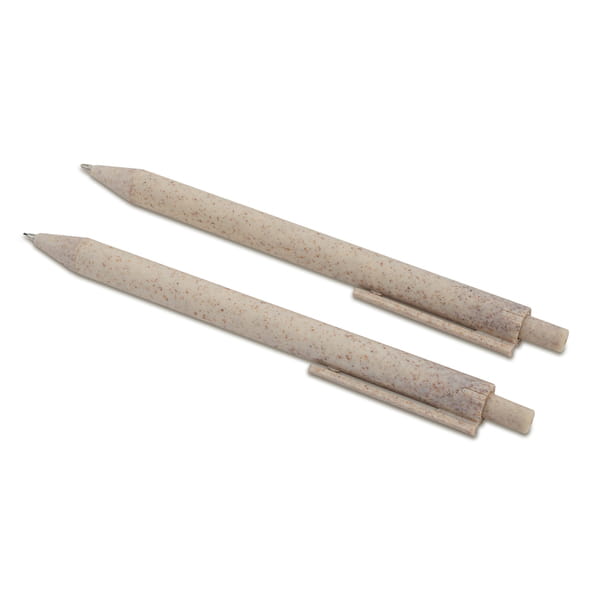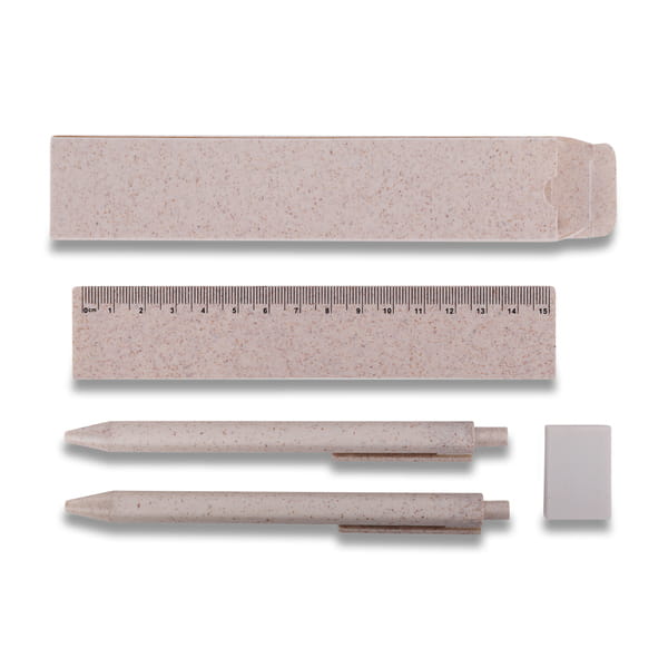 Zestaw szkolno-biurowy ze słomy pszenicznej. Składa się z długopisu, ołówka automatycznego, linijki i gumki. Całość zapakowana w pudełko. Niebieski wkład.